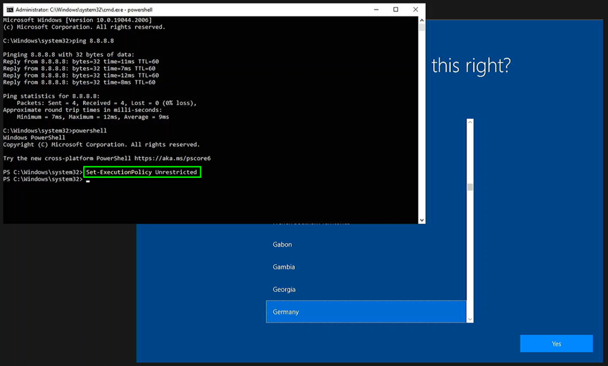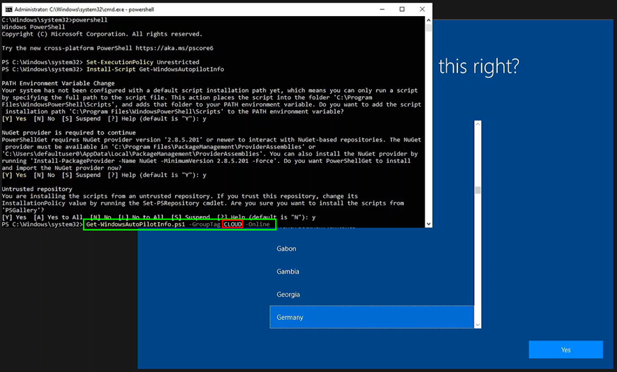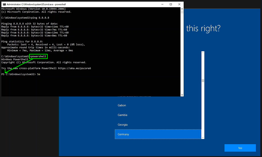 To do this, we use the key combination SHIFT (+FN) + F10 in the Windows OOBE to start a CMD. There we first switch to a Windows PowerShell session by entering powershell: