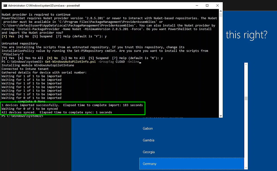 Here you have to log in with an authorized Azure AD account to be able to upload the hardware hash. The upload takes 1-2 minutes and then the script reports the successful upload.