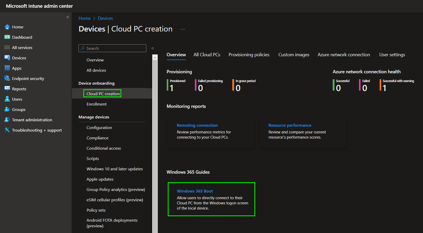 Switch to https://endpoint.microsoft.com and go to Devices. In the Devices Blade navigate to Cloud PC creation and click on Windows 365 Boot:
