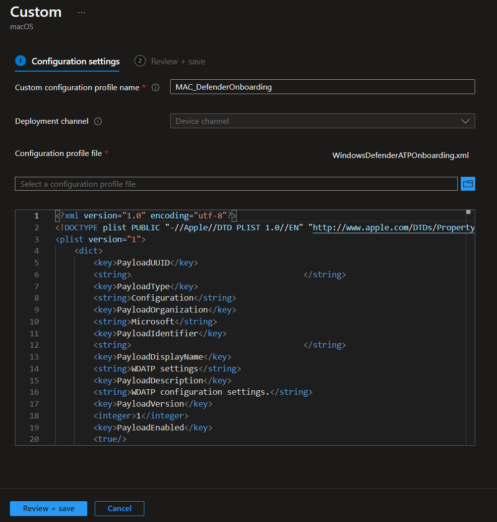 You need to download your tenant-custom XML File from the Microsoft Security Portal (https://security.microsoft.com/) go to Settings an under Defender for Endpoint in the Onboarding blade choose macOS and download the Onboarding package. Within the .ZIP file you will find your tenant-custom XML file with the right settings. The XML file will look similar to this sample:
