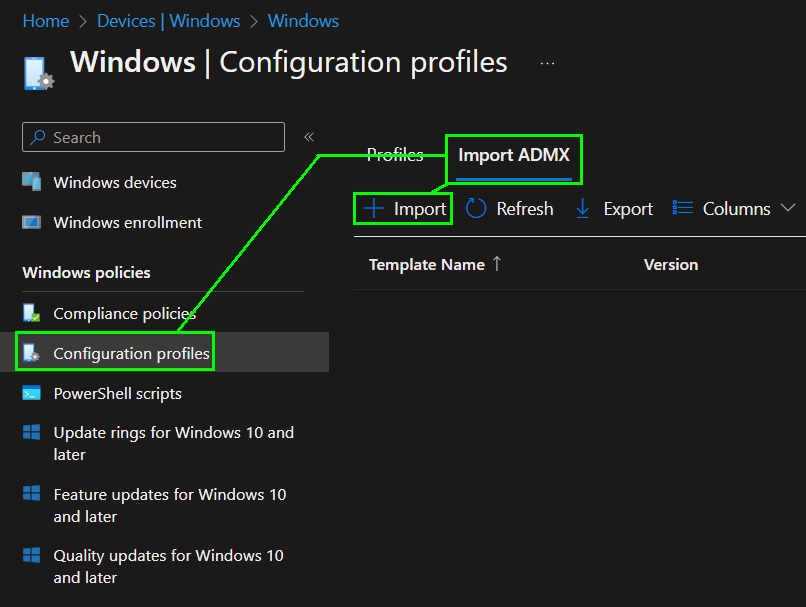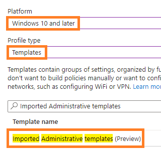 Select „Windows 10 and later“, „Templates“ and then „Imported Administrative templates“: