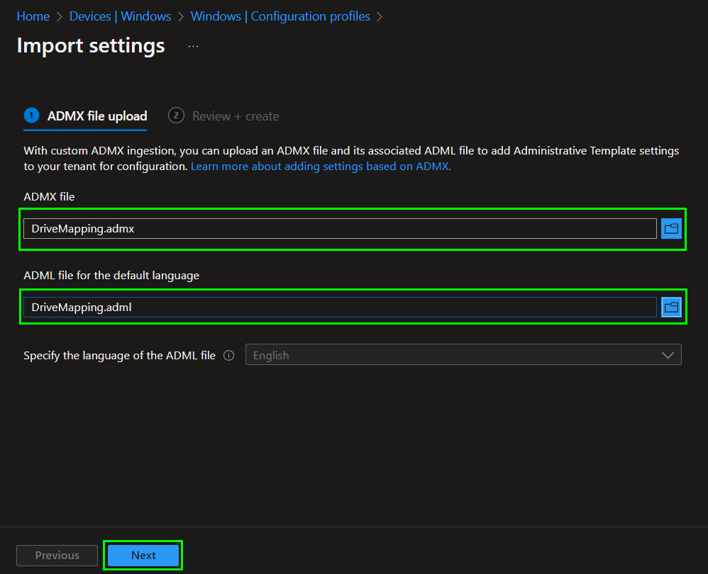 Obtain the ADMX template for network drive mapping from the Github: https://github.com/DanielBradley1/Public/tree/main/Intune%20Files/Drive%20Mapping. (Credit to Mark Thomas and the HTMD Community for creating this useful ADMX files)