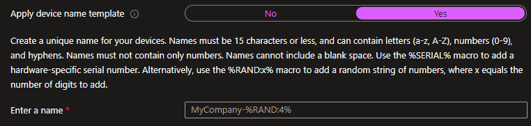 The last option is also very cool. You can define the hostname of the devices from Autopilot. Here you can set static names or use a Random or Serial number String. From my experience in most cases we used an location code as the prefix followed by the devices serial number. You can build that for example like that FRA-%SERIAL%. When we now have a device from Frankfurt with a serial number of 12345 the hostname will become FRA-12345.