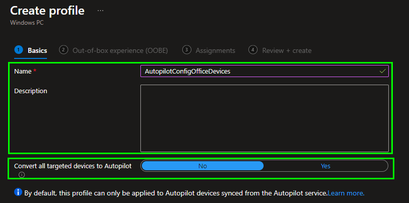 Define a name, optionally a description and if you want that scoped devices will be migrated to Autopilot: