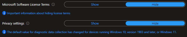 The next two steps are about hiding License Terms and Privacy Settings. So that the user does not have to read and accept them. Privacy Settings can be pre-defined with Intune configuration profiles so you can hide them too.