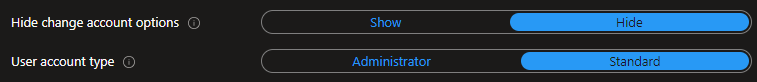 Now there are 2 very important steps. You need to define if the user can select if he wants to be a normal or an admin user and how the default experience is. Think about when you enroll an windows device without management. There the user who is created in the Out-of-the-Box experience will become local administrator but you do not want office users to be administrators on their work devices. So you can select (only with Autopilot for Windows devices) that the first user will become a standard user and not an admin user. I would definitely recommend you to set this. If needed you can grant users admin rights later on with Intune.