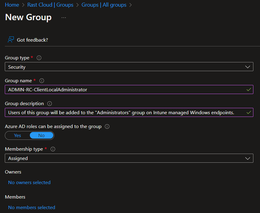 First, create an Entra ID group that will be added to the local administrator group on the Intune managed clients.