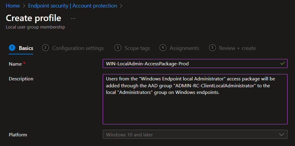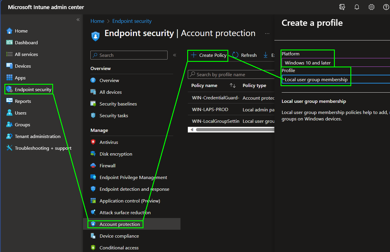 In Microsoft Intune, configure a device configuration profile that adds the Entra ID group to the local administrator group on the managed clients. To do so navigate to Endpoint security -> Account protection -> „+ Create Policy“ and create a new „Local user group membership“ rule: