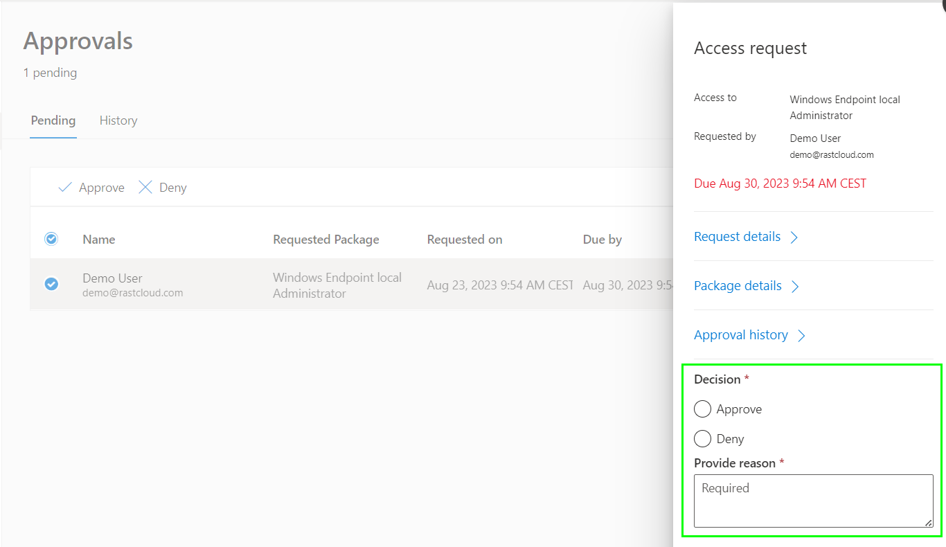 Here the approver can review the request an approve or deny it, by simply clicking on „Review“ at the request: