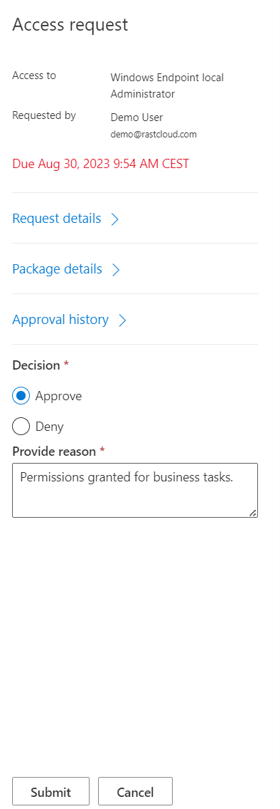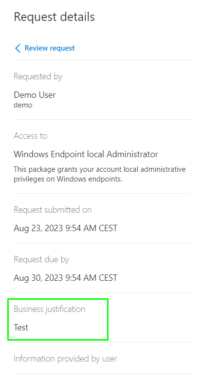 By clicking on „Request details“ we can see more details like the justification that the user had need to fill: