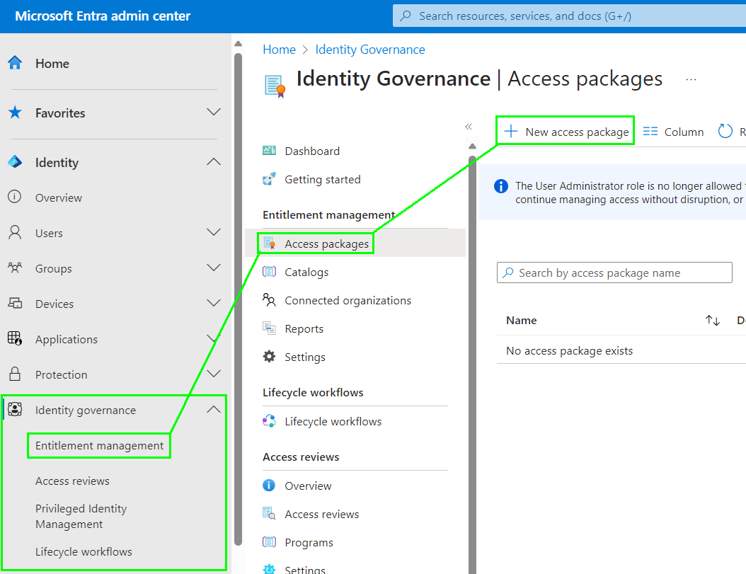 Navigate to https://entra.microsoft.com/ and open „Entitlement management“ at „Identity governance“. Click on „Access packages“ and „+ New access package“: