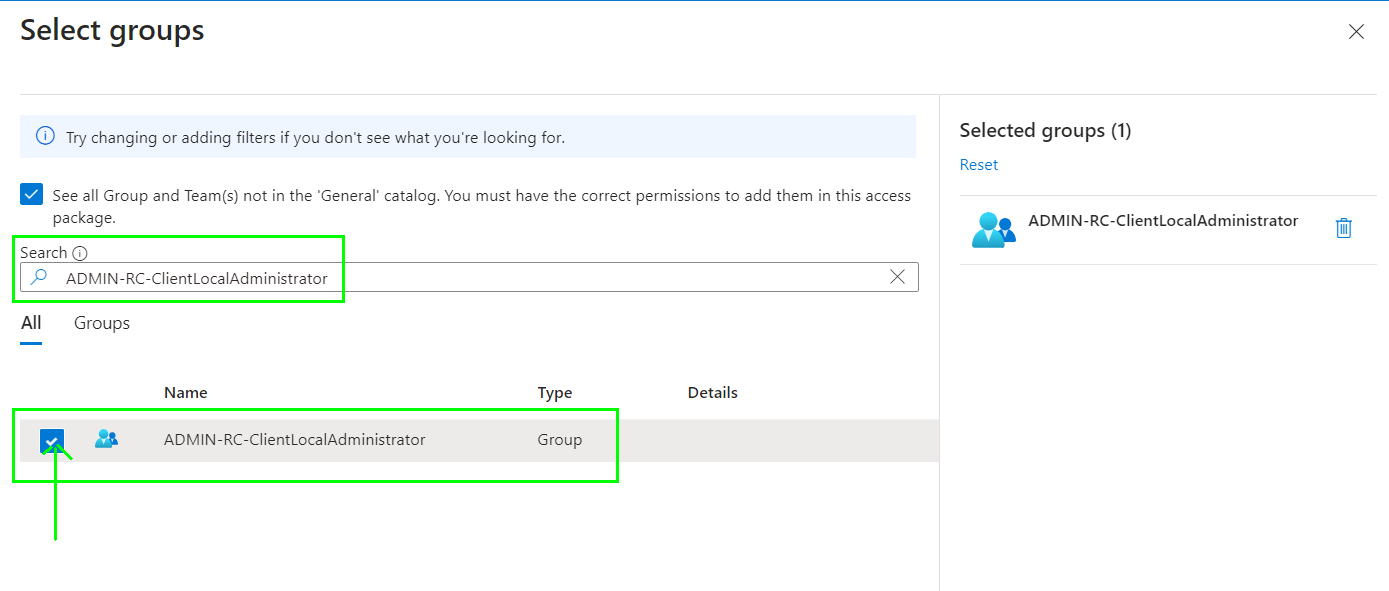 Make sure that the local group is set to „Administrators“ and choose „Add (Update)“. Then click on „Select users/groups“ and add the earlier created Entra ID group which will be assigned through the access package: