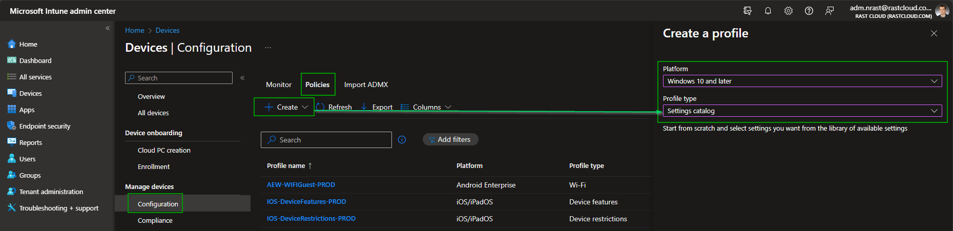 Configure the Settings Catalog Configuration Profile: In this section, select „Policies“ and choose „Create profile.“ From the profile list, pick „Settings Catalog“.