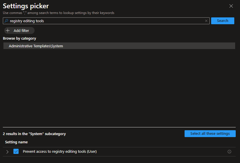 Search for Registry Access Policy: In the settings catalog, search for „registry editing tools“. This setting can be found under „Administrative Templates\ System.“