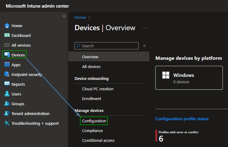 Start by navigating to https://endpoint.microsoft.com and open „Configuration“ under „Devices“: