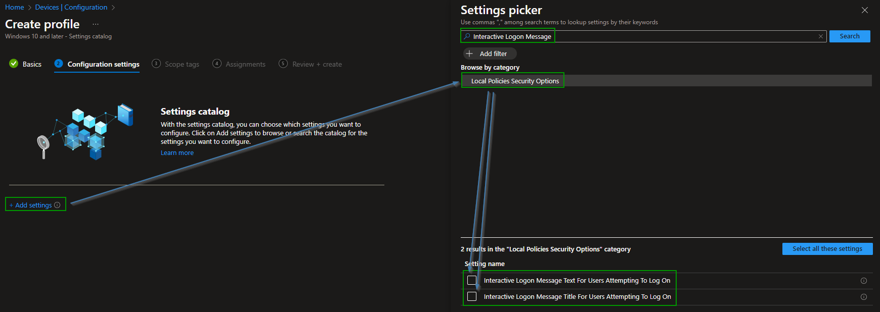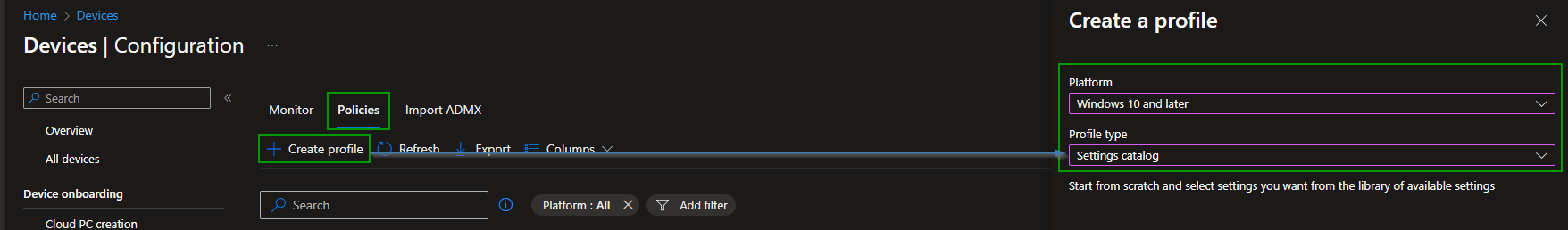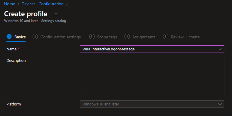 Create a new „Settings catalog“ profile for „Windows 10 and later“: