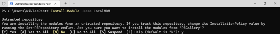Press Enter to execute the command. PowerShell will then install the LocalMDM module from the gallery. It’s important to note that you may need to run PowerShell as an administrator for the installation to be successful or you need to add „-scope CurrentUser“ to the command to install the module only for your user.