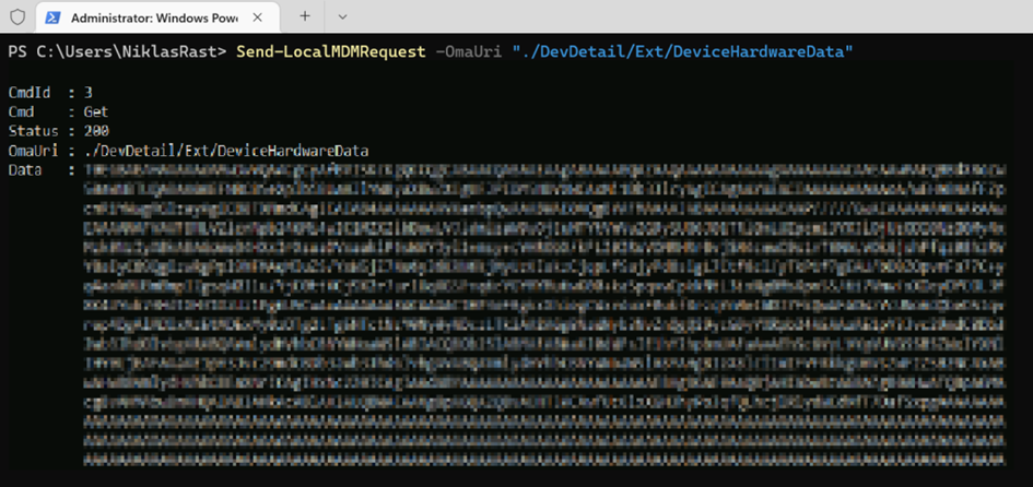 Send-LocalMDMRequest -OmaUri "./DevDetail/Ext/DeviceHardwareData"