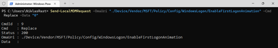 Send-LocalMDMRequest -OmaUri "./Device/Vendor/MSFT/Policy/Config/WindowsLogon/EnableFirstLogonAnimation" -Cmd Replace -Data "0"