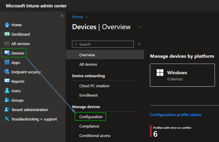 Start by navigating to https://endpoint.microsoft.com. Here click on „Configuration“ in the „Devices“ blade: