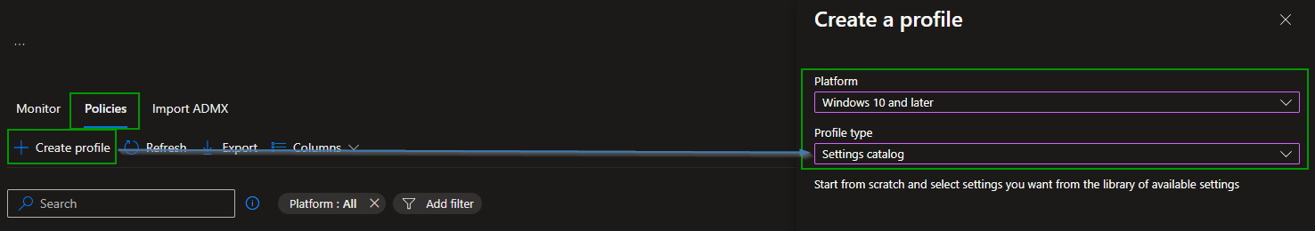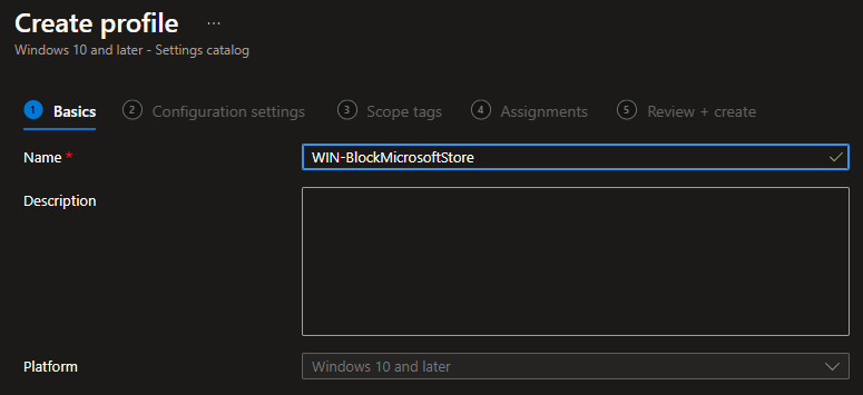 Next create a new „Settings catalog“ configuration profile for „Windows 10 and later“: