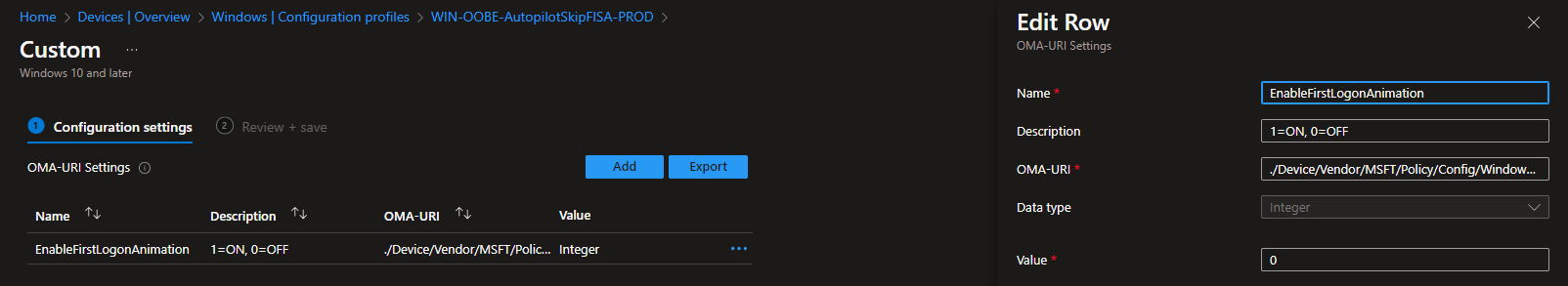 To disable the First Logon Animation, follow these steps using a Custom Intune profile with OMA-URI settings: