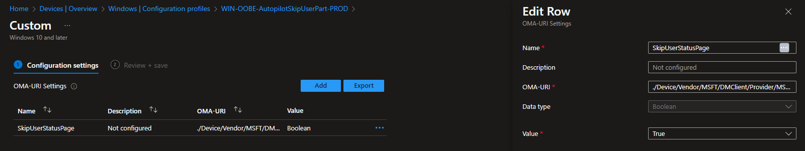 OMA-URI: ./Device/Vendor/MSFT/DMClient/Provider/MS DM Server/FirstSyncStatus/SkipUserStatusPage