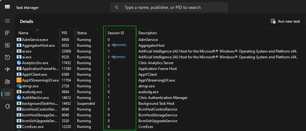 As you can see when checking in Task Manager there are some tasks running in Session 0 for the system and some in Session 1 for the current user: