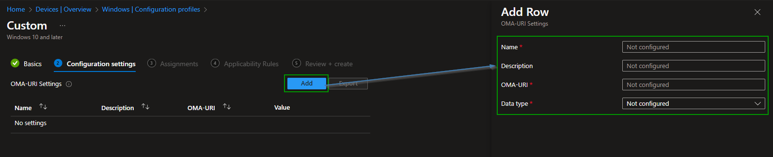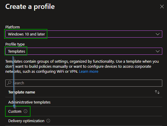 Now that we have the configuration lets hand over to https://endpoint.microsoft.com and create a new custom configuration profile for Windows.