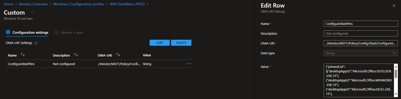 OMA-URI: ./Vendor/MSFT/Policy/Config/Start/ConfigureStartPins