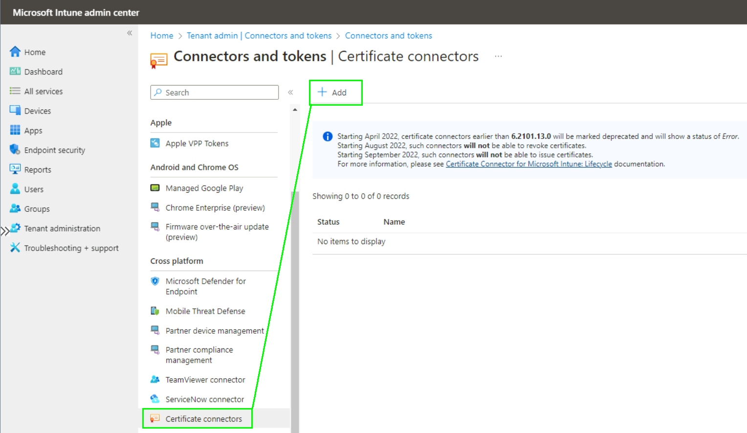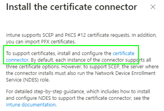 There are a few perquisites to be setup before you can setup and use certificate deployment with the Intune NDES Connector.