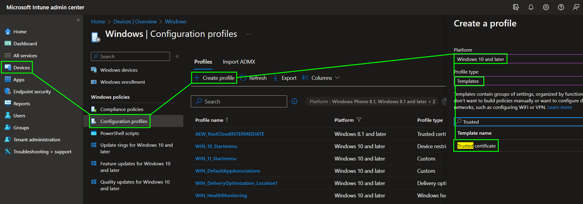 Next we need to Upload the Trusted Root CA Certificate so that the client devices can request and trust new certificates from your Enterprise CA. So navigate to https://endpoint.microsoft.com and create a new Configuration Profile for your platform device. In this example we are going to use Windows as our platform. Search for the „Trusted certificate“ in the Templates.