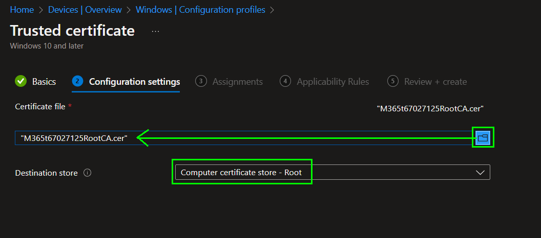Upload your Root CA certificate and set the Destination store to „Computer certificate store – Root“: