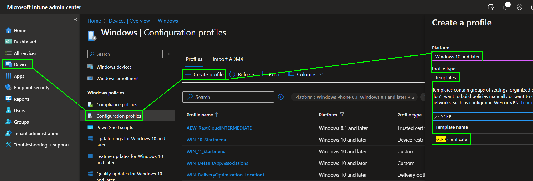 Now we need to create an SCEP profile in Intune to request User Authentication certificates. Start by creating a new configuration profile with „SCEP certificate“ from the Templates: