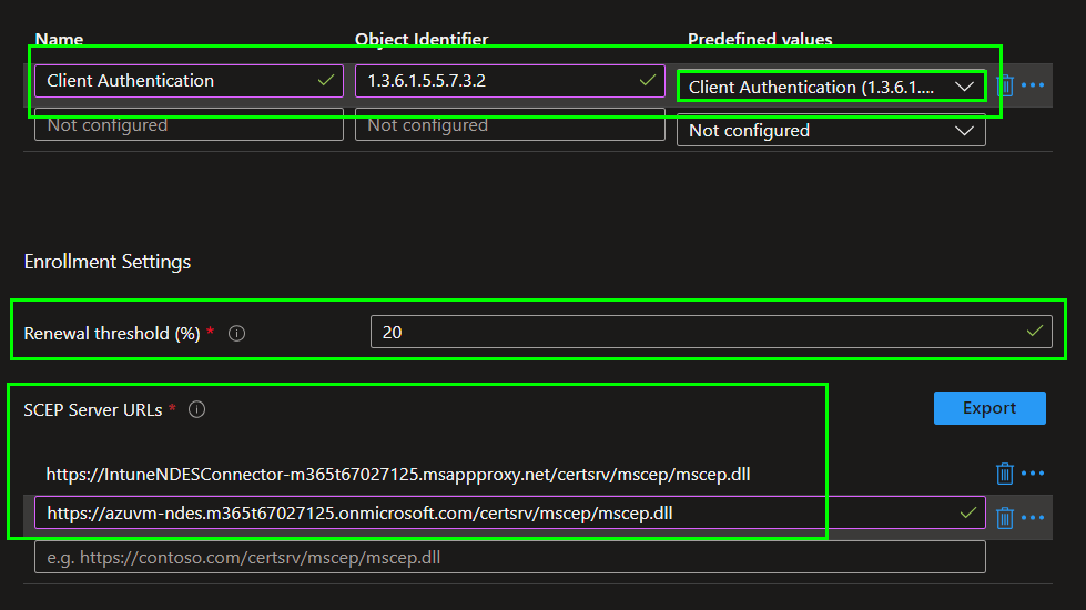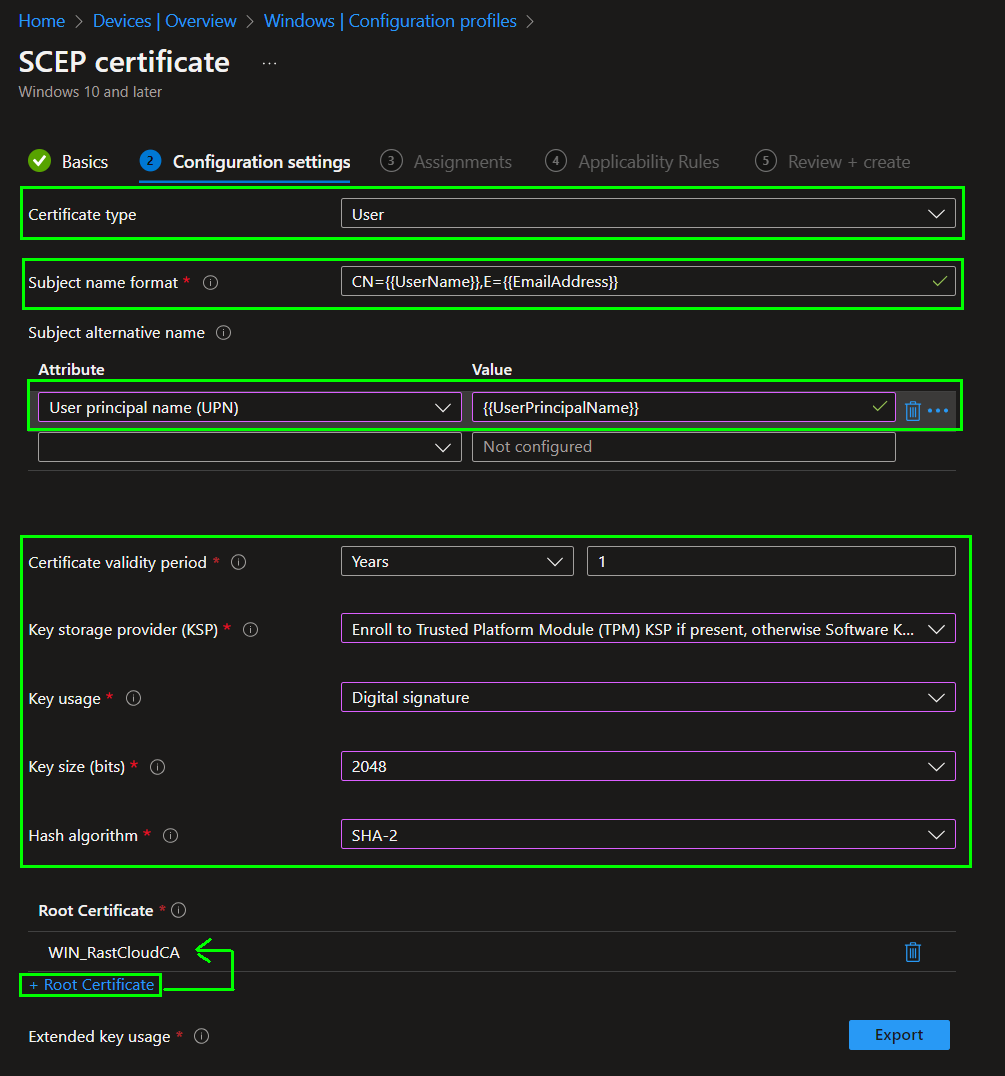 Now you need to configure the SCEP request details, which will then be send from the client to Intune, forwarding to the NDES Connector which reqests the certificate from your Enterprise CA. The generated certificate will then be send backwards this way to your device.