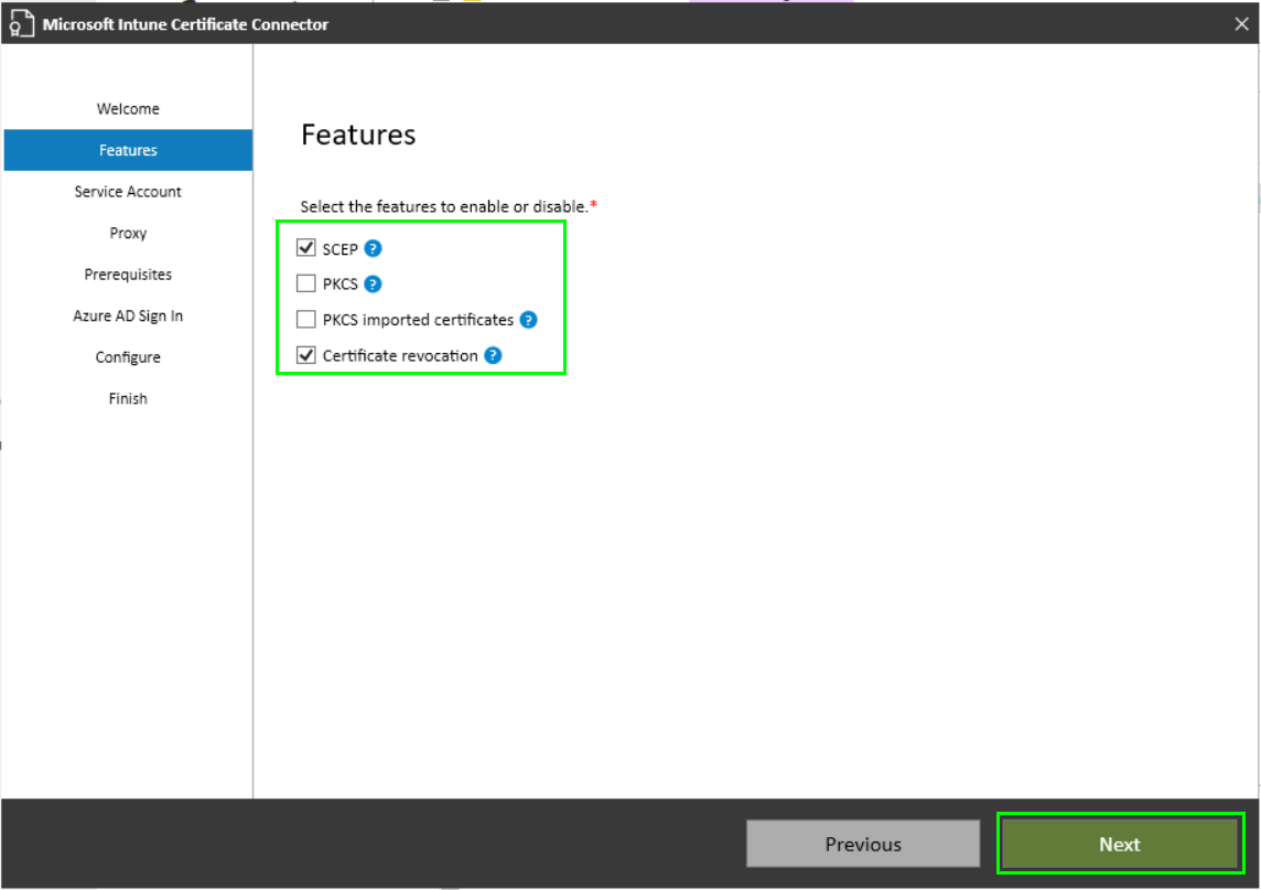 Check the features that you need. This example will talk about SCEP certificates so I am checking SCEP and Certificate revocation:
