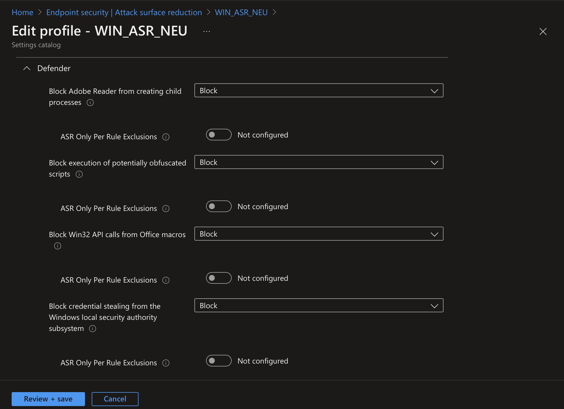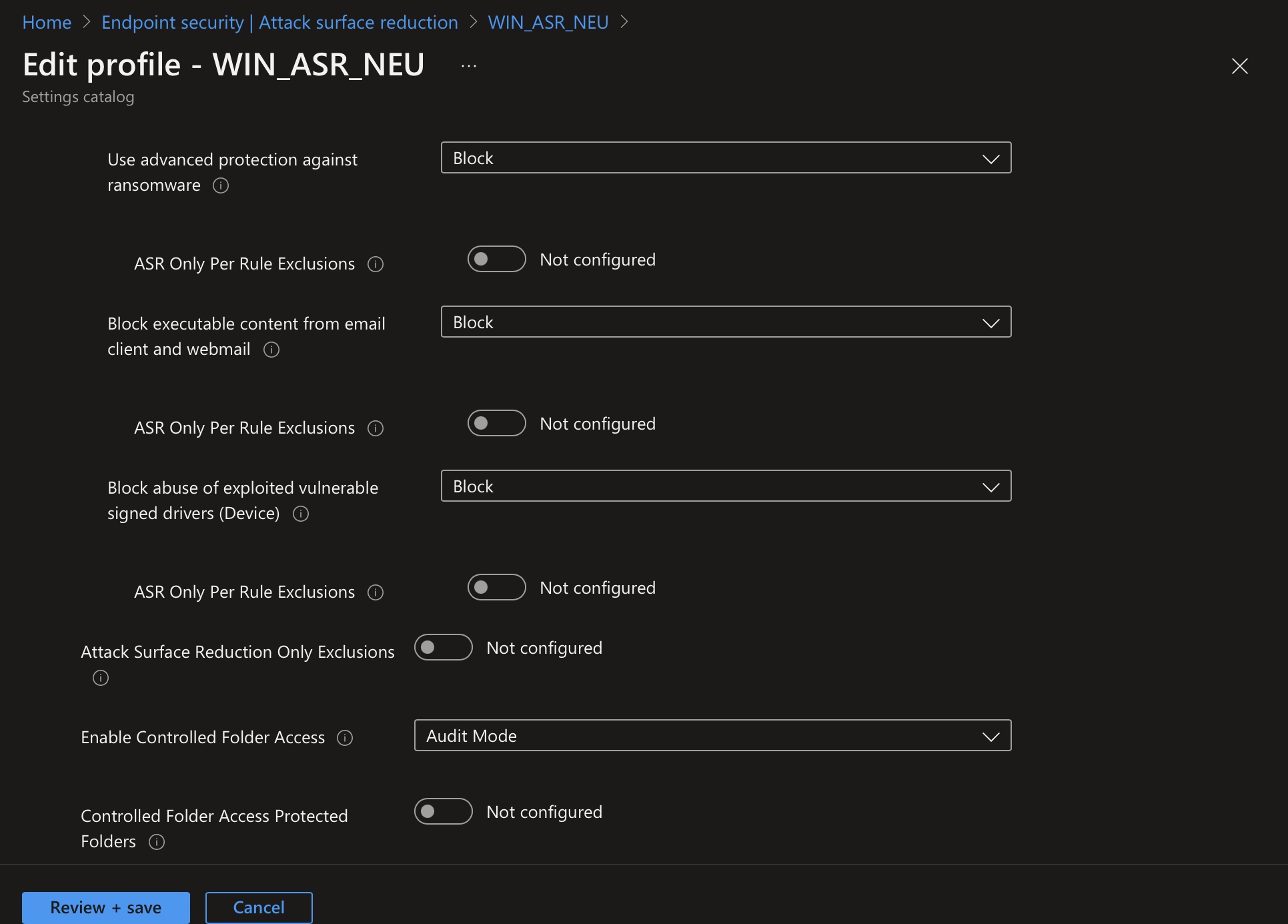 The following example shows an ASR policy that can be used to harden the client and closes many security gaps in advance: