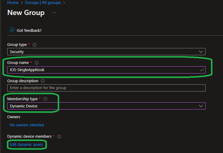 Within the Entra ID or Intune portal create a new group and set the „Membership type“ to „Dynamic device“: