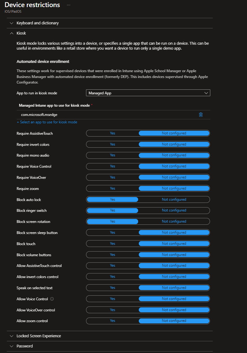 And now we are at a point where we define the iOS OOBE. For our single-app kiosk (in this example) we want the device to auto-enroll without being attached to a user and of course we want it supervised (which is the „MDM-mode“ in iOS where you have much more control over the device“. I would recommend to enable „Locked enrollment“ as this ensures that the device enrolls completely to Intune before the user can use it.
