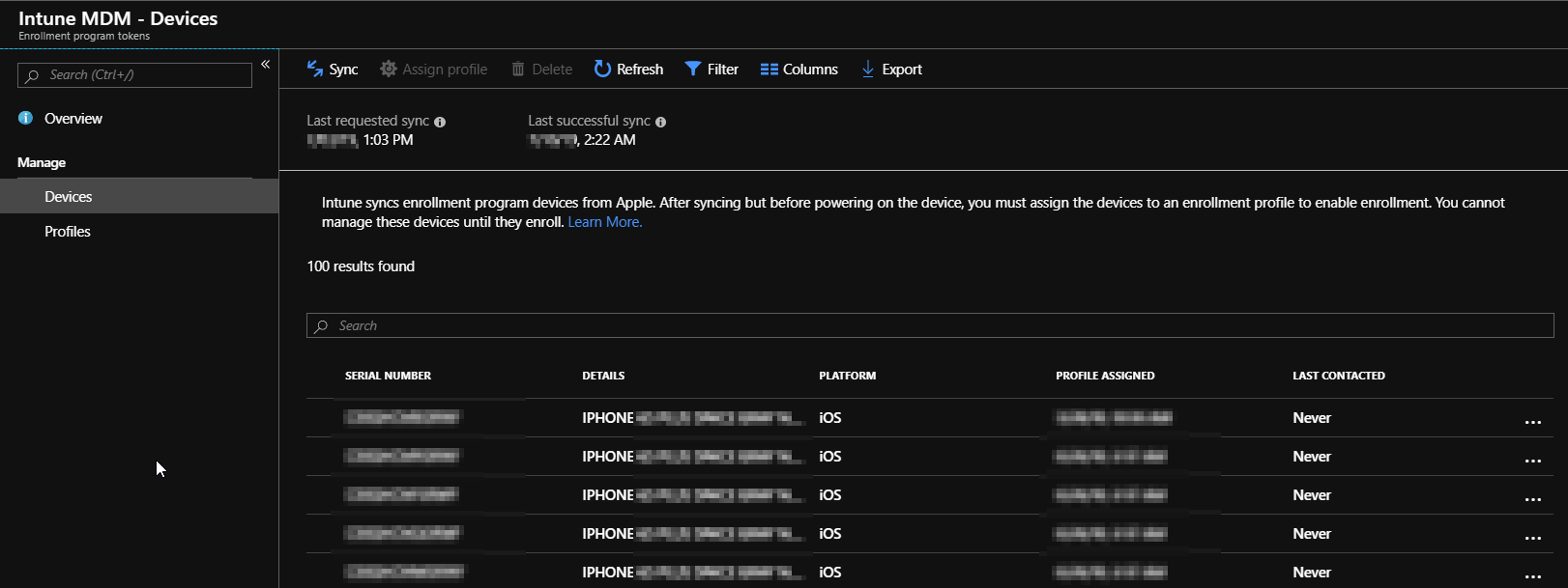 Now you should be ready. But you might ask „How do I now assign the tag to a device?“….that’s simple. Go back to „Devices“ -> „iOS/iPad OS enrollment“ -> „Enrollment program tokens“ but now switch to „Devices“ instead of profiles from above. There you will see all iOS devices that have been added to your Apple Business Manager account and synced to Intune. Check the device by its serial number and the click on „Assign profile“ from the top menu: