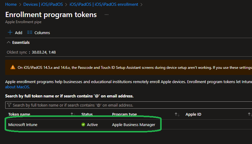 Now if you never created a profile in this way (where you of course need an Apple Business Manager account attached to your Intune) then navigate to „Devices“ -> „iOS/iPad OS enrollment“ -> „Enrollment program tokens“…