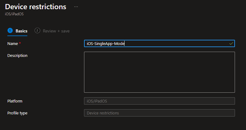 So now we have our Entra ID group and the Apple Business Manager profile ready. Next we are going to create a „Device restrictions“ profile in Intune at the iOS/iPad OS section.