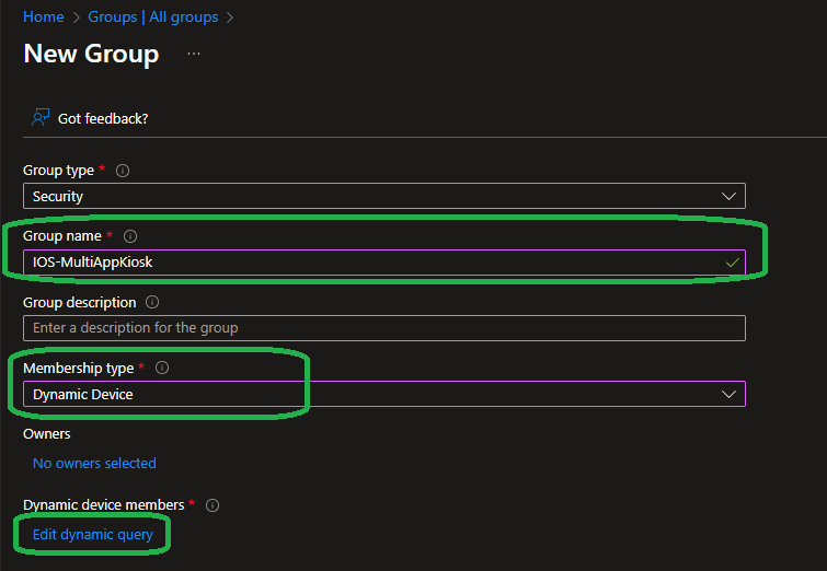 Within the Entra ID or Intune portal create a new group and set the „Membership type“ to „Dynamic device“: