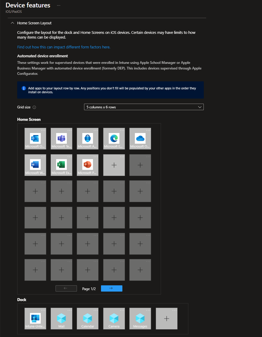In this example i picked the Microsoft Office apps and placed the Company portal in the iOS Dock as this is an „Office kiosk“ for demo purposes. Save and assign the profile to our earlier created Entra ID group and of course do not forget to assign the defined apps to the device group as well 😉 otherwise they will not be deployed to the device.
