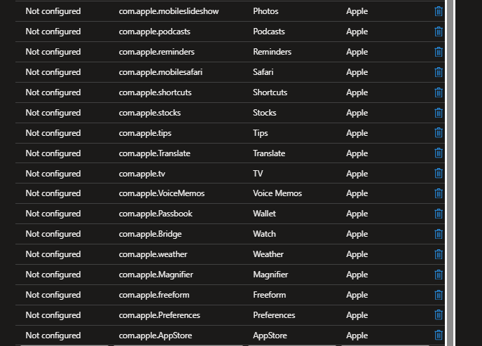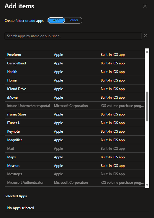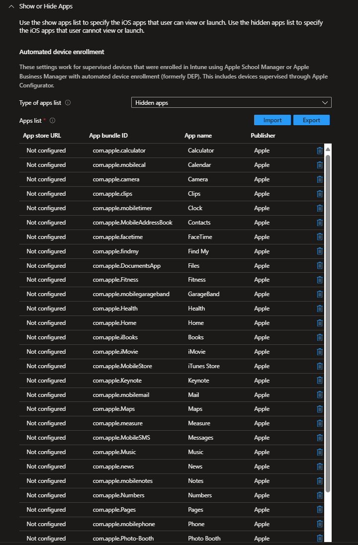 Next search for the „Show or Hide Apps“ section. That is where we define which apps should be hidden from the home screen – so we set „Type of apps list“ to „Hidden apps“ and in this example I hide ALL iOS apps. You need to define the App bundle ID, App name and Publisher…those can be found online or from this screenshot: