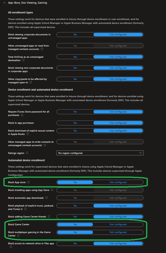 Search for the „App Store, Doc Viewing, Gaming“ section and set „Block App store“ to yes – we do not want users to be able to download and install more apps in our defined kiosk. Optionally Block Game Center: