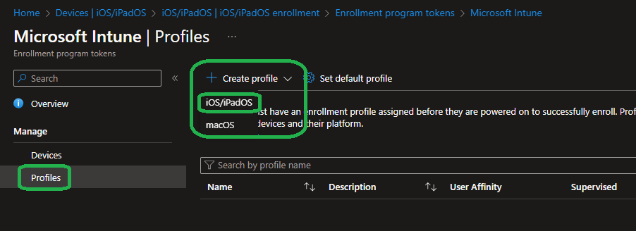 …and at „Profiles“ we want to create a new „iOS/iPadOS“ profile: