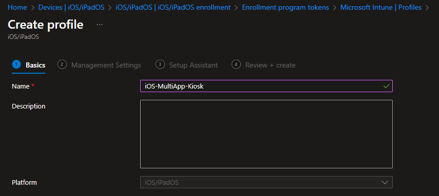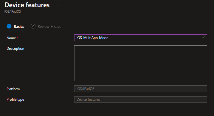So now we have our Entra ID group and the Apple Business Manager profile ready. This time we have to create a little bit more that for the Single-App kiosk. Firstly we are going to create a „Device features“ profile in Intune at the iOS/iPad OS section.