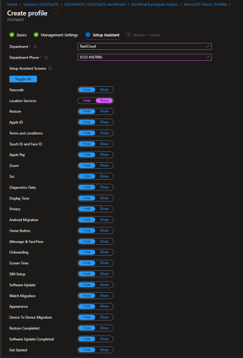 In the next step of this wizard you need to define details about the department or company that is responsible for the devices and which steps the iOS OOBE will show. For this example I disabled all except „Location services“ as we need the location for the right time on the device: