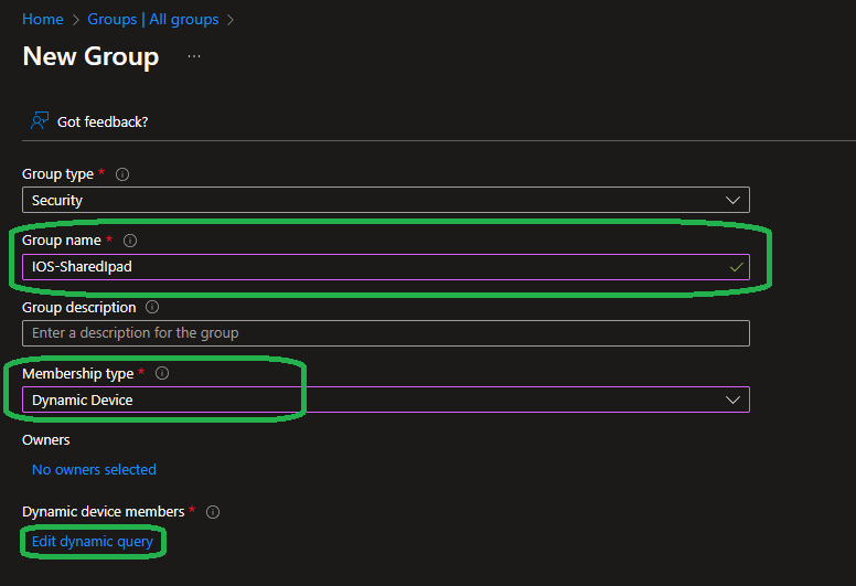 To start we (as always) need a Entra ID group that we can assign our configurations to which will act as the bundle. So create a new group with a dynamic membership rule: